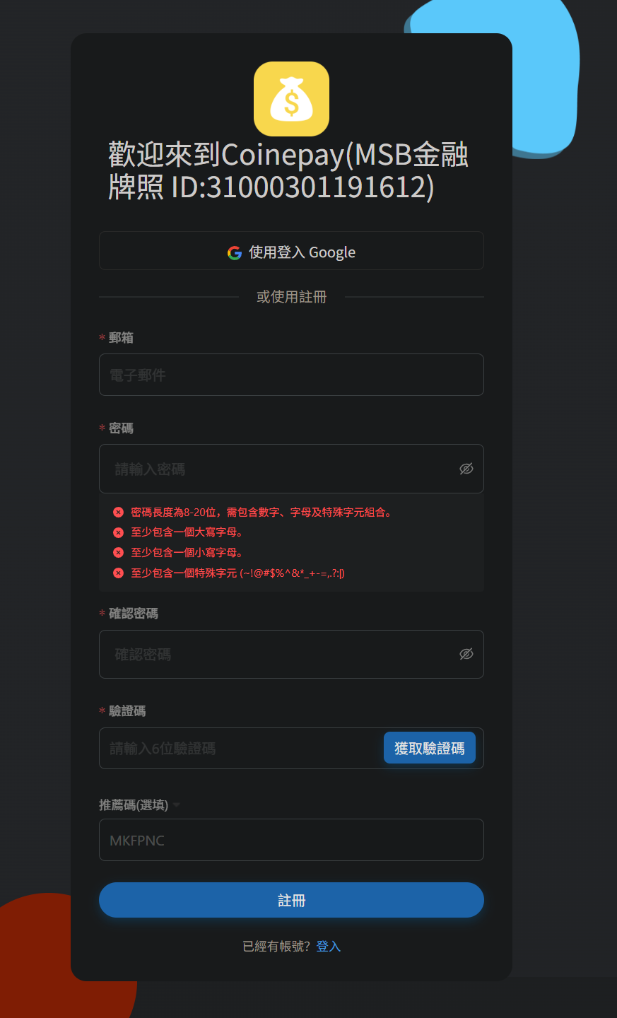 https://bpay.net/?code=MKFPNC 前往官方网站注册账号。嫌麻烦的话,用谷歌账号登陆。