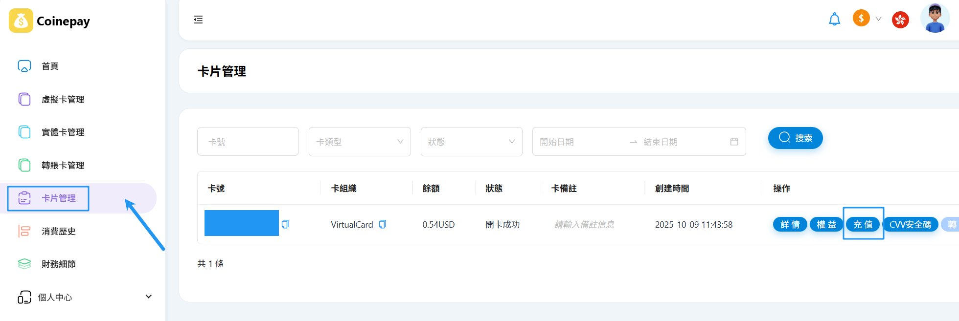 选择虚拟卡管理,新增信用卡,需要先充值余额。↓